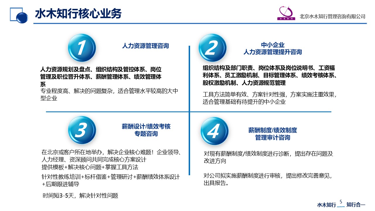北京水木知行管理咨詢有限公司(www.bjsmzx_com.432222.cn)專注提供人力資源管理咨詢、人力資源管理培訓、人力資源招聘咨詢、人力資源獵頭服務業務;咨詢業務范圍包括組織結構與管控體系、崗位管理體系、薪酬管理體系、績效管理體系,咨詢形式包括全過程咨詢、教練式咨詢和特訓班;培訓業務包括企業基礎管理...[詳情]